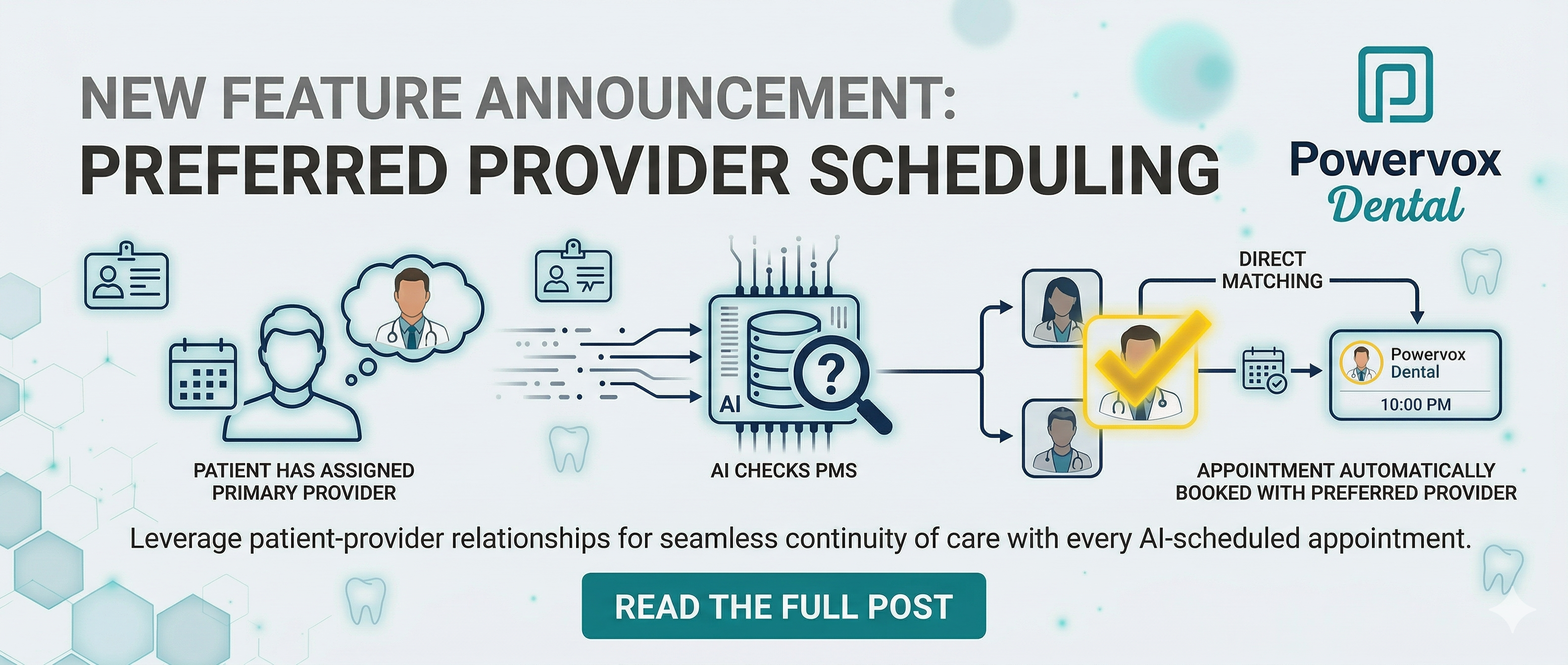Powervox integrates deeply with your PMS to mirror your manual front-desk logic. By recognizing primary provider assignments, we help practices maintain high clinical standards while enjoying the efficiency of 24/7 automated booking.